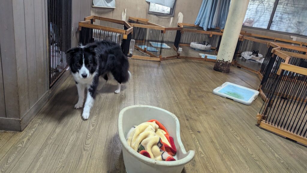 黒柴ニコくんがチェックインしました。初めてのご利用なので緊張しているようですね。尻尾が下がっていましたが、少ししたら上がってきました。ただ、ベッドにいるのが落ち着くようなのでサークルで様子を見ています。