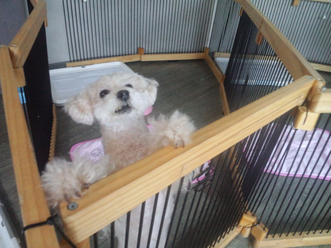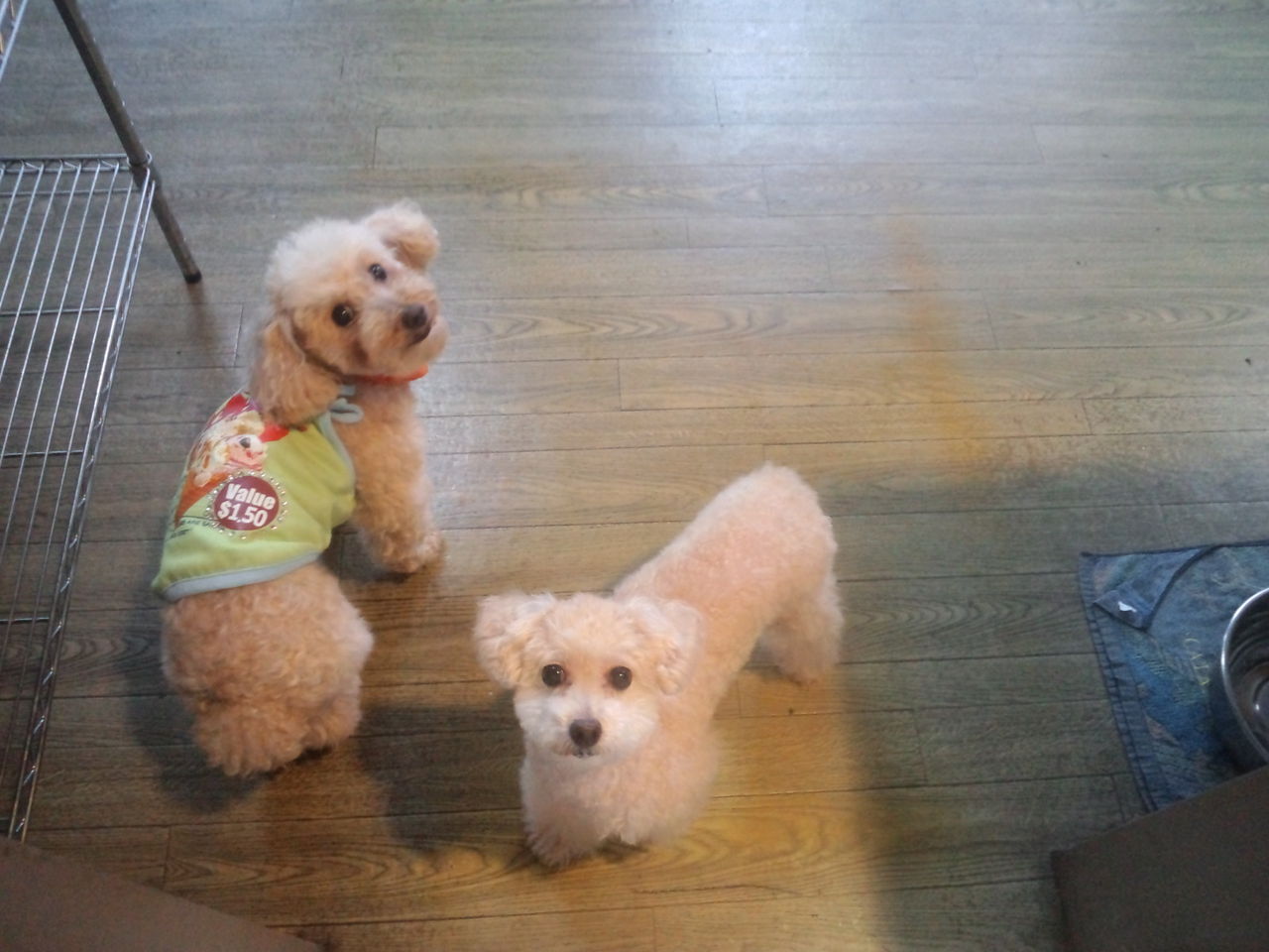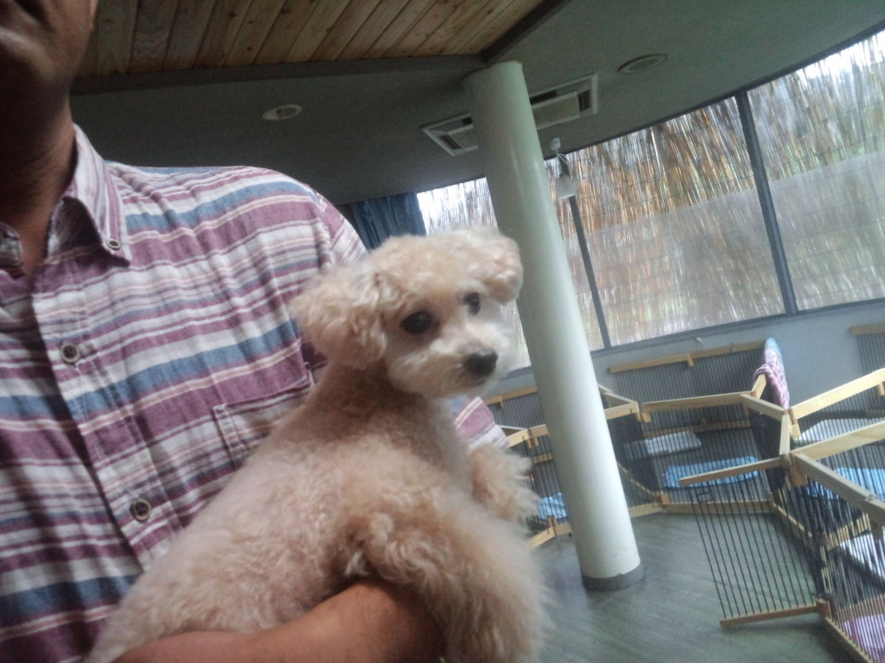 常連さんのリキくんはすぐにサークルから出てみんなとご挨拶! トイプーベルくんと一緒になってスタッフHに甘えています。