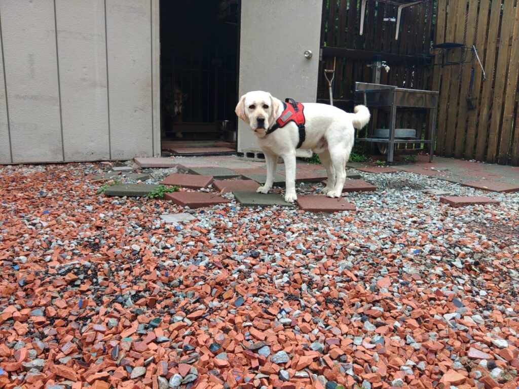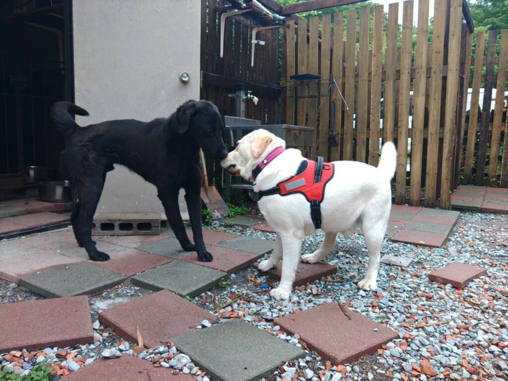 ラブラドールむさしくんがチェックインしました。初めてのご利用ですが、緊張している感じもなく他のわんちゃんと挨拶したり、デッキの匂いを嗅ぎ回っています。