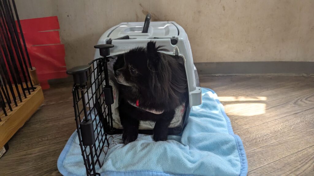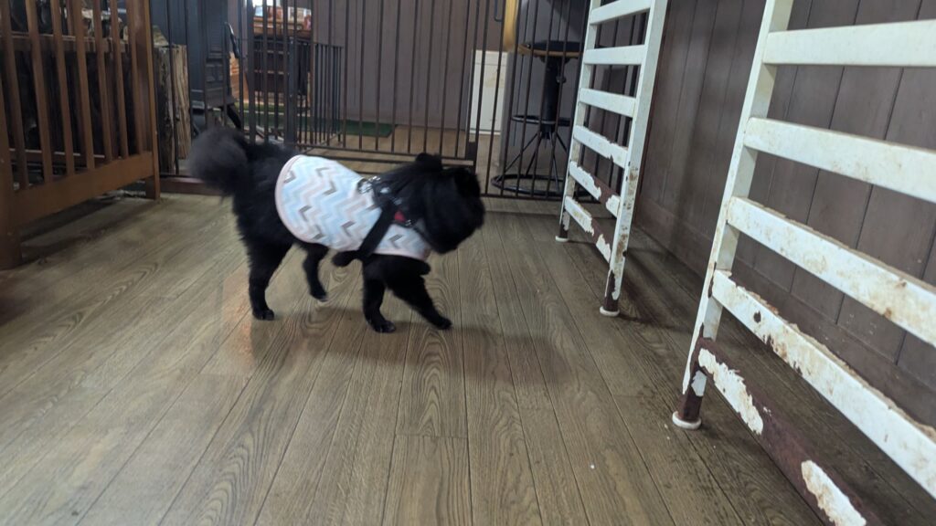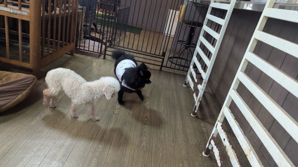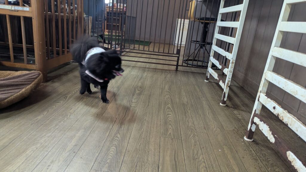 ポメラニアンクウちゃんがチェックインしました。最初はハウスに籠もっていましたが、少ししたら出たくなったようで共有スペースにいます。わんちゃんは好きじゃないかな?避け気味に過ごしています。
