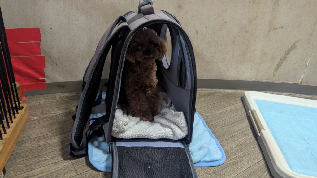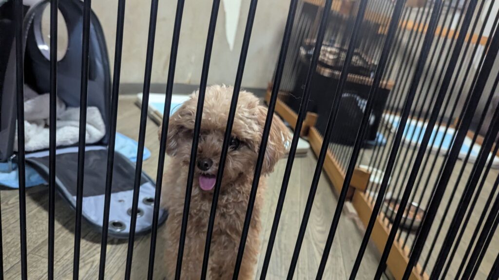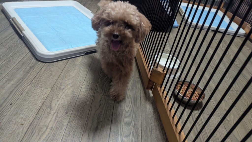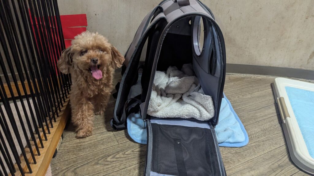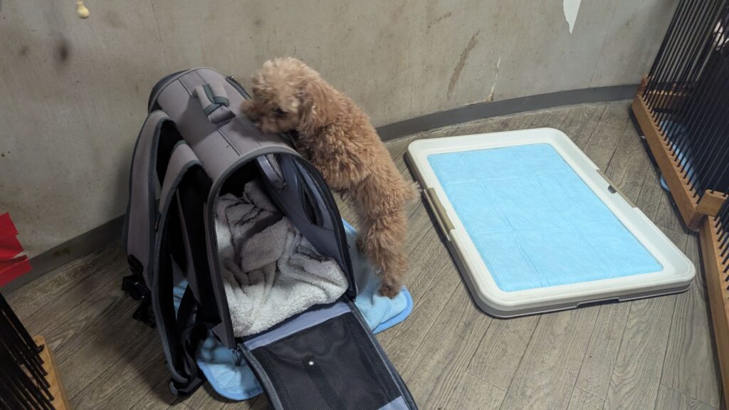 トイプーココアちゃんがチェックインしました。今日はもう遅いのでサークルにいてもらってまた明日みんなと一緒にしてみますね。緊張している感じもあるのですが、バッグに入れば落ち着くかな?