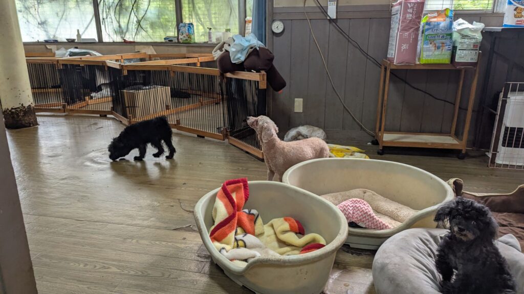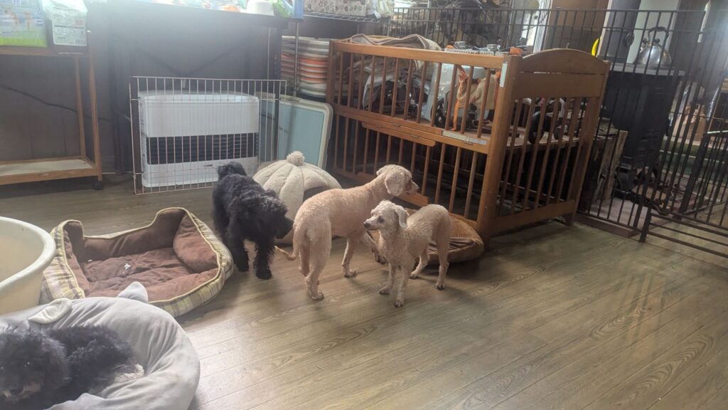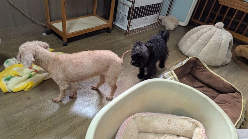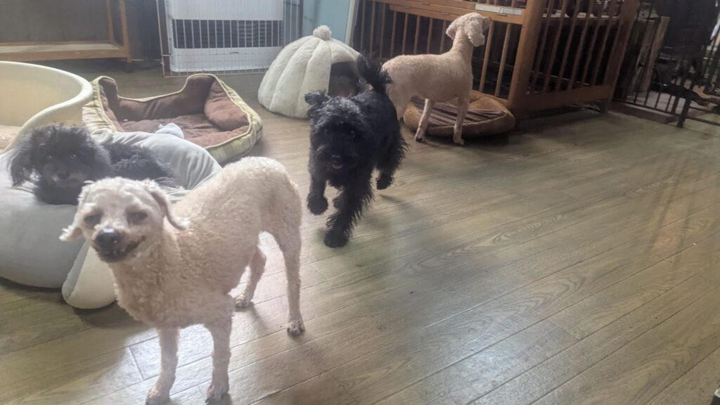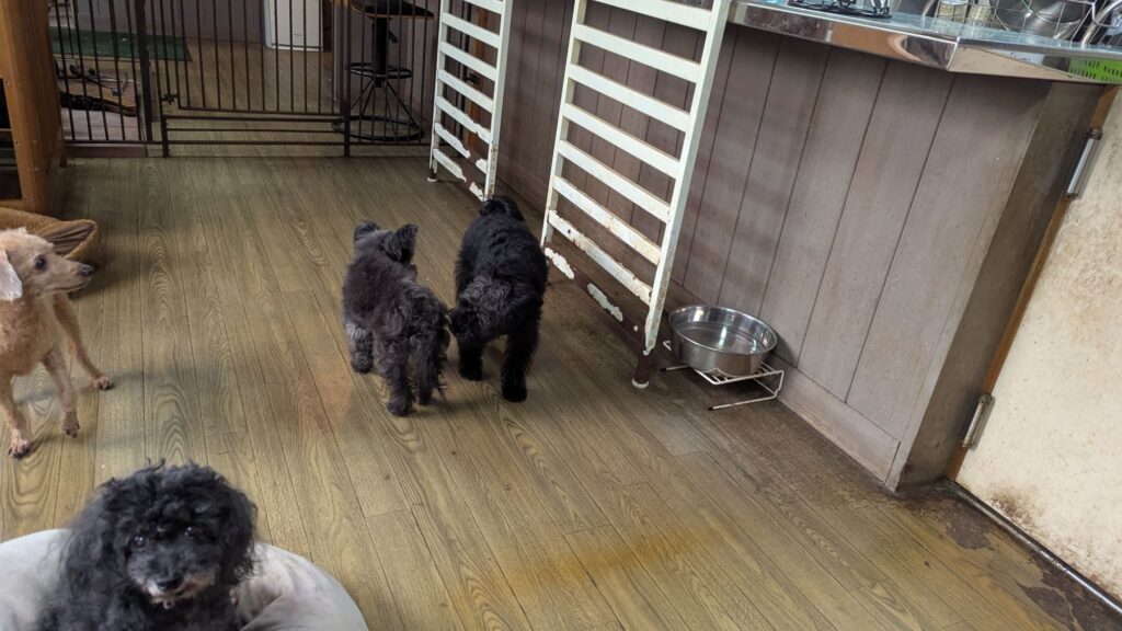 常連さんのシュナプーアンジくんがチェックインしました。慣れっこなアンジくんは緊張ゼロなのでサークルには入りません。店内を駆け回って忙しそうですねぇ。いつも楽しそうに過ごしてくれます!
