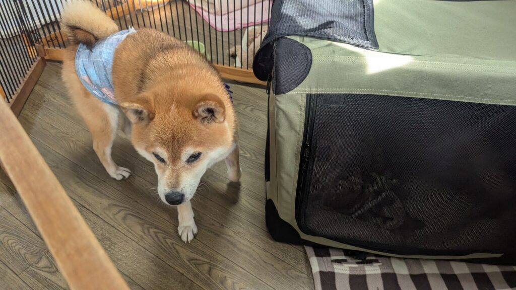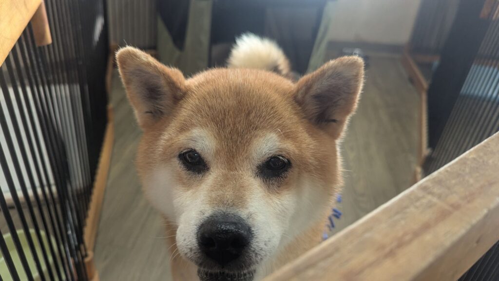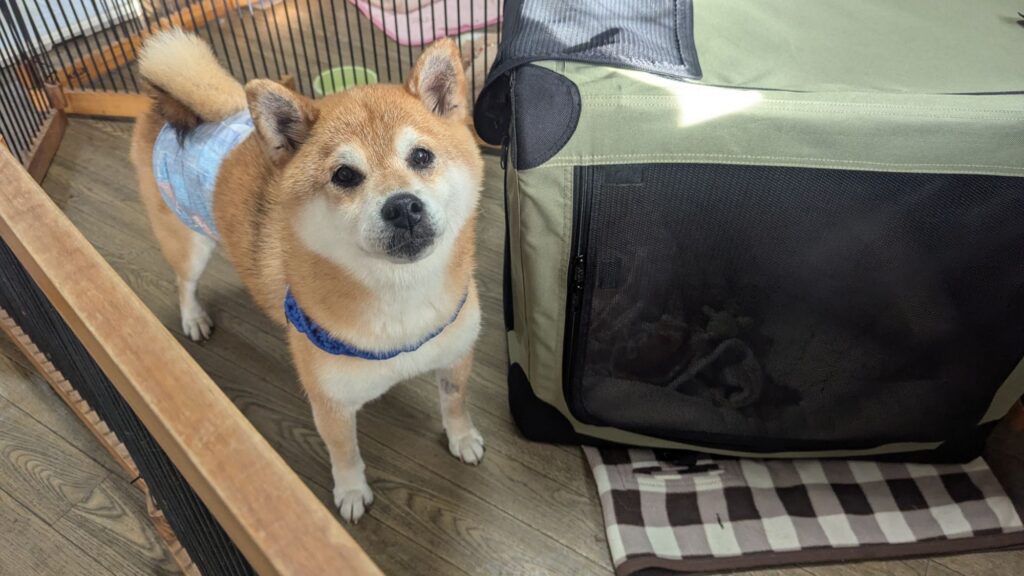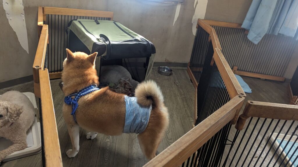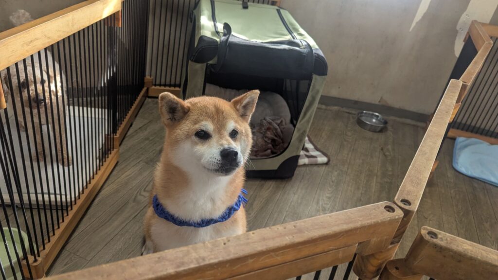 柴犬ハウルくんがチェックインしました。初めてのご利用ということもあり、緊張しているようなのでサークル出様子を見ています。