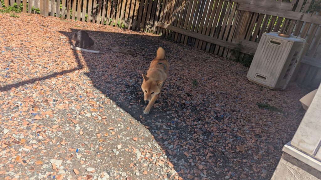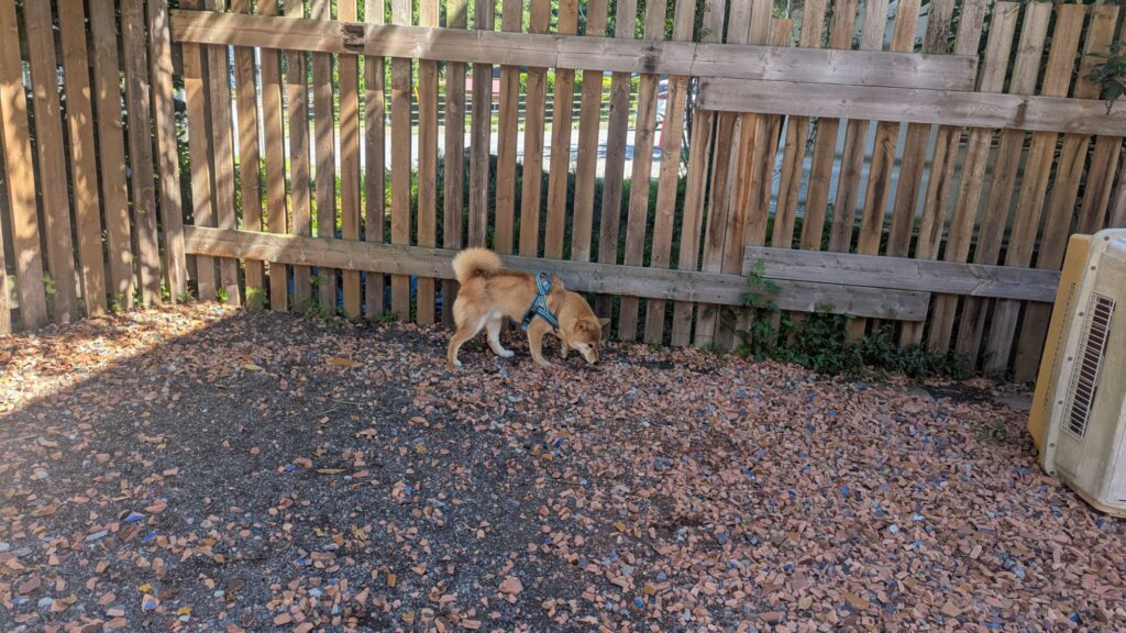 デッキを駆け回って匂いを嗅いだり、つけたりしています。