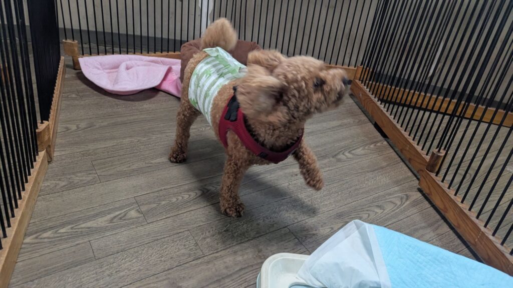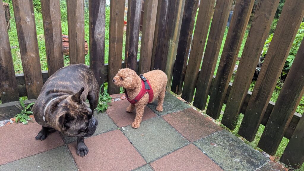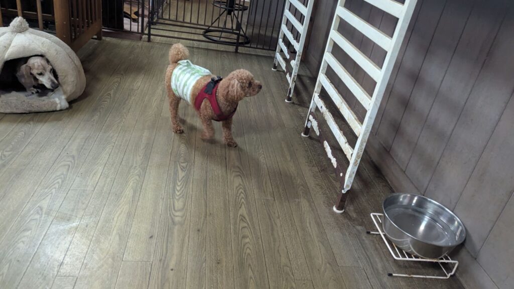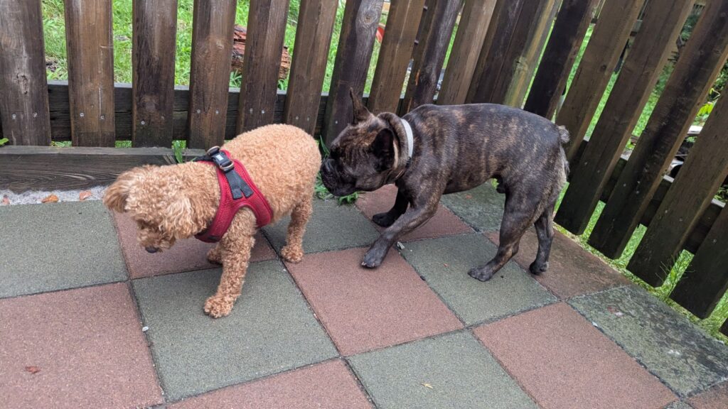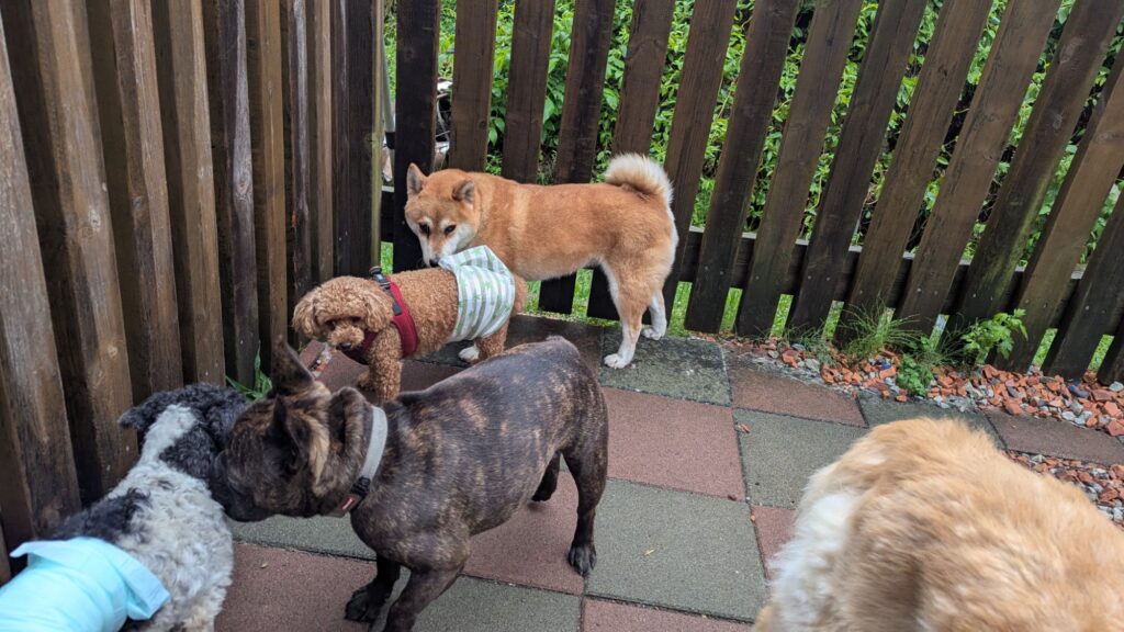 トイプーソラくんがチェックインしました。今日はアクティブ組がたくさんですね。ソラくんはまだ2歳だからまだまだアクティブだよね。雨も止んだのでデッキに出ています。緊張しつつもわんちゃんに寄って行っています。