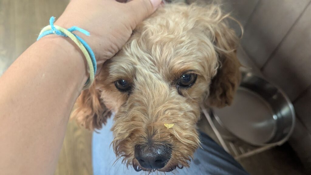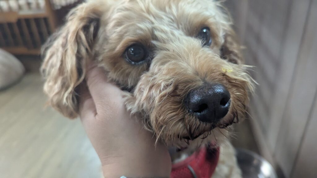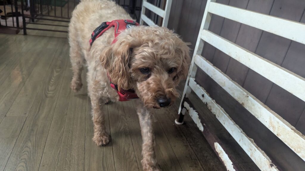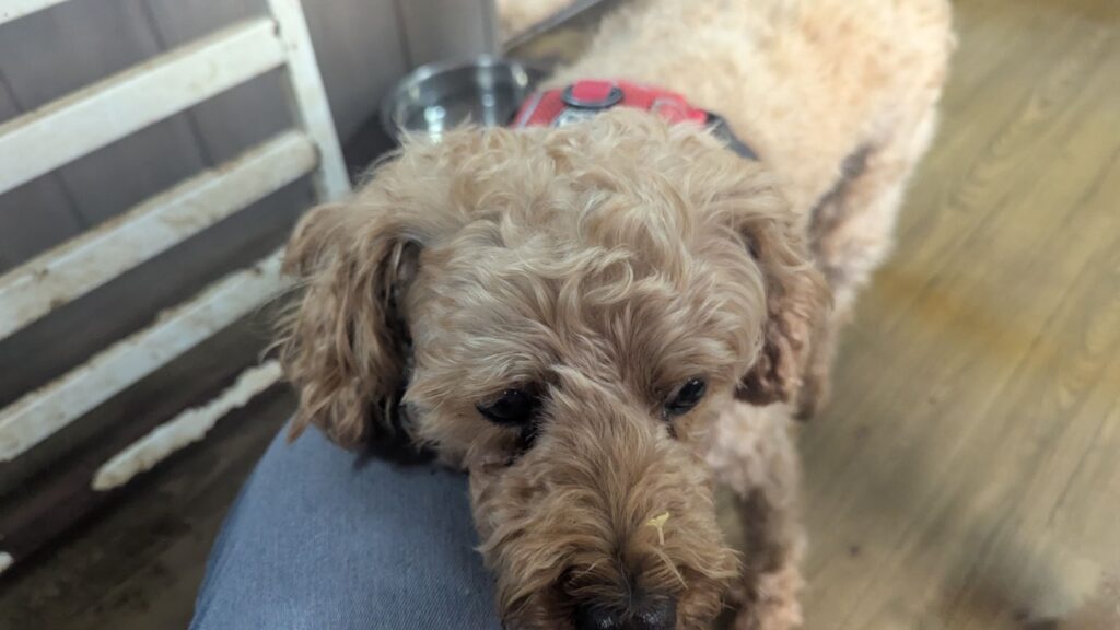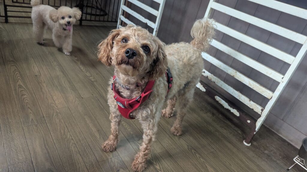 春に一度来てくれたミックスクルルくんがチェックインしました。緊張しているようなのでまずは店内で様子を見ています。他のわんちゃんの匂いを嗅いだり、スタッフに甘えたりしています。
