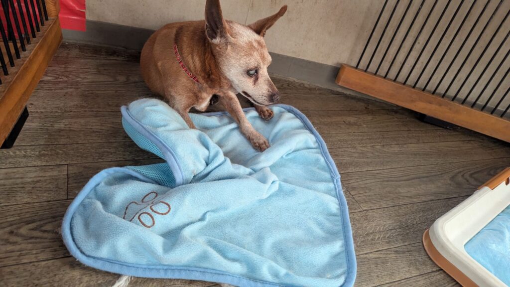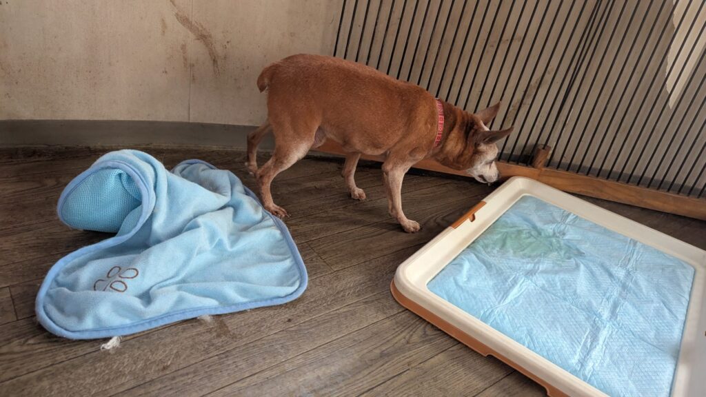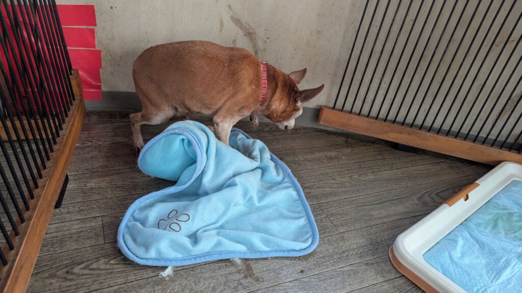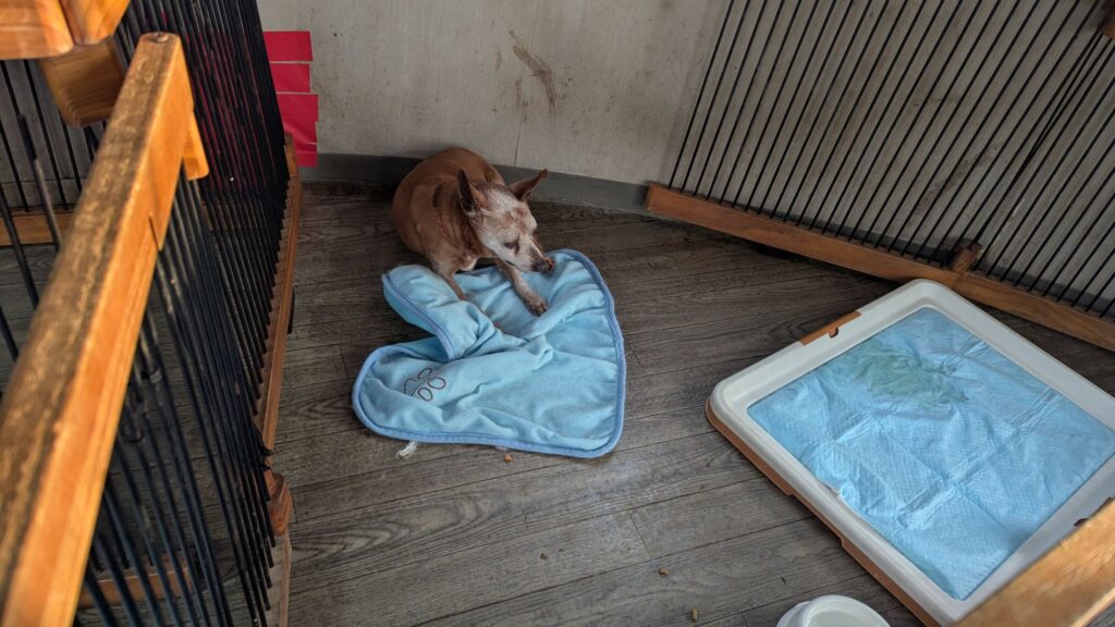 わんちゃんには緊張しちゃうとのことなのでサークルで様子を見ています。