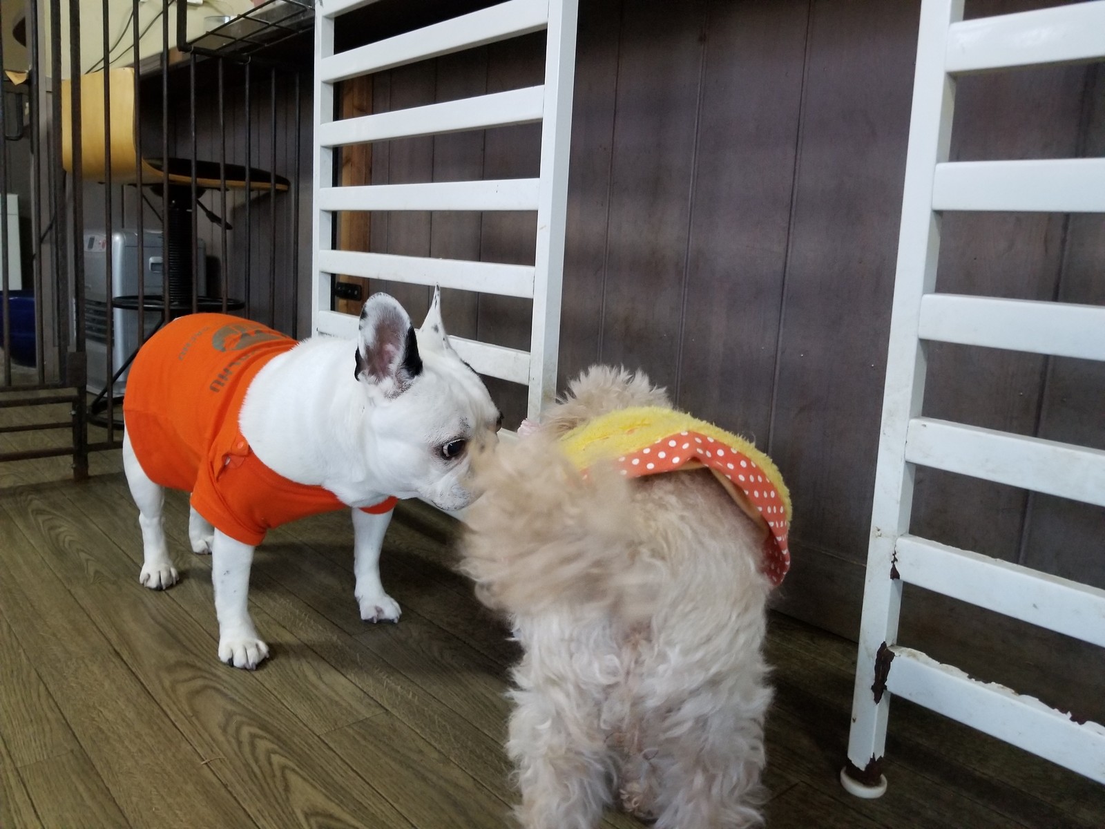 常連フレブルのゴンくんがチェックインしました。いつもはアクティブなゴンくんですが、今日は柴くるみちゃんのテンションに押され気味。