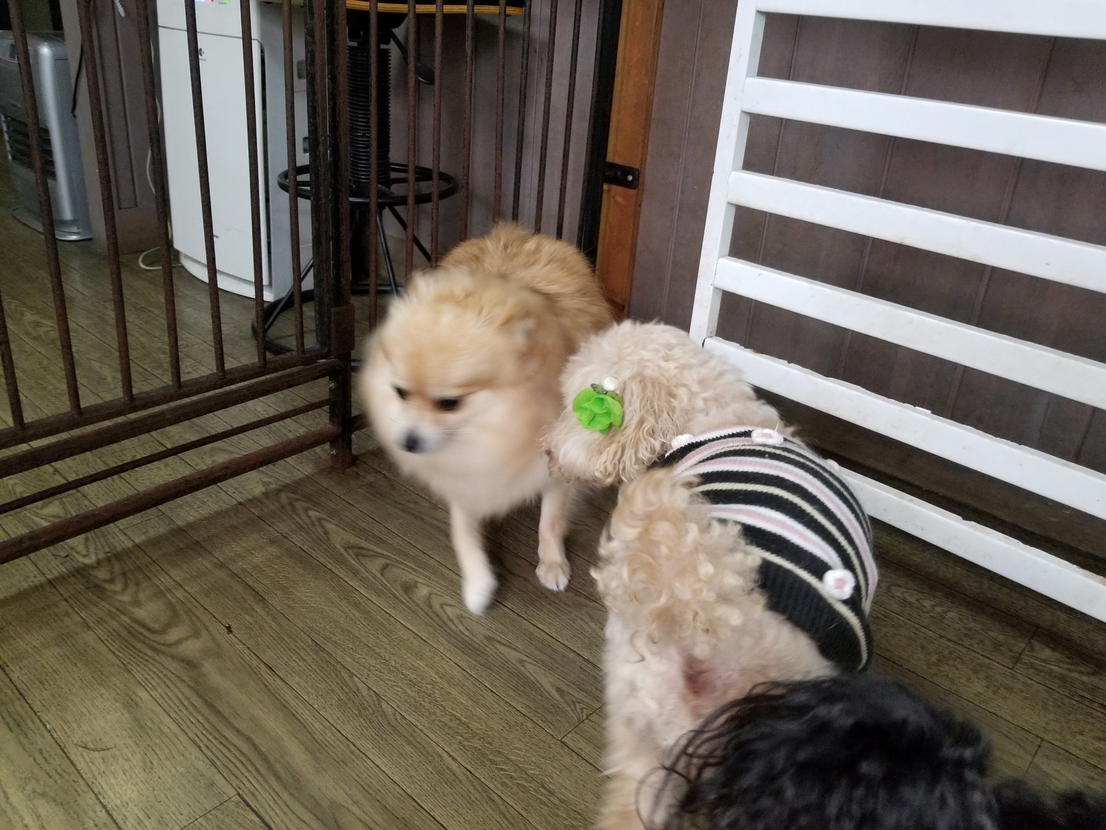 何度か来てくれているのでかなり慣れてきたようでサークル越しにトイプーベラちゃんと挨拶しています。